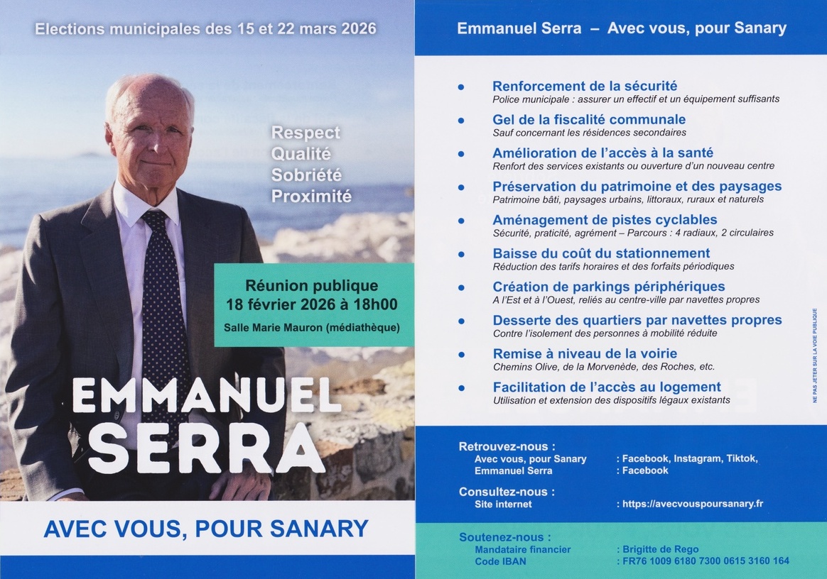 La 5e réunion publique d’Emmanuel Serra aura lieu à la salle Marie-Mauron, près de la médiathèque le 18 février 2026 à 18h00.